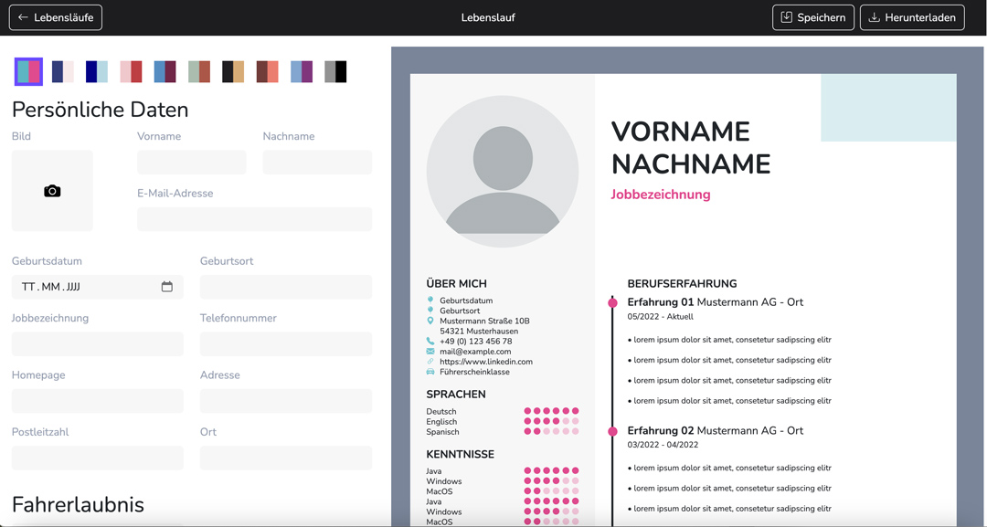 Ja, jederzeit. Du kannst zwischendurch zwischen verschiedenen Layouts und Farbvarianten wechseln – ohne deine eingegebenen Inhalte zu verlieren. So findest du ganz einfach das Design, das am besten zu dir passt.