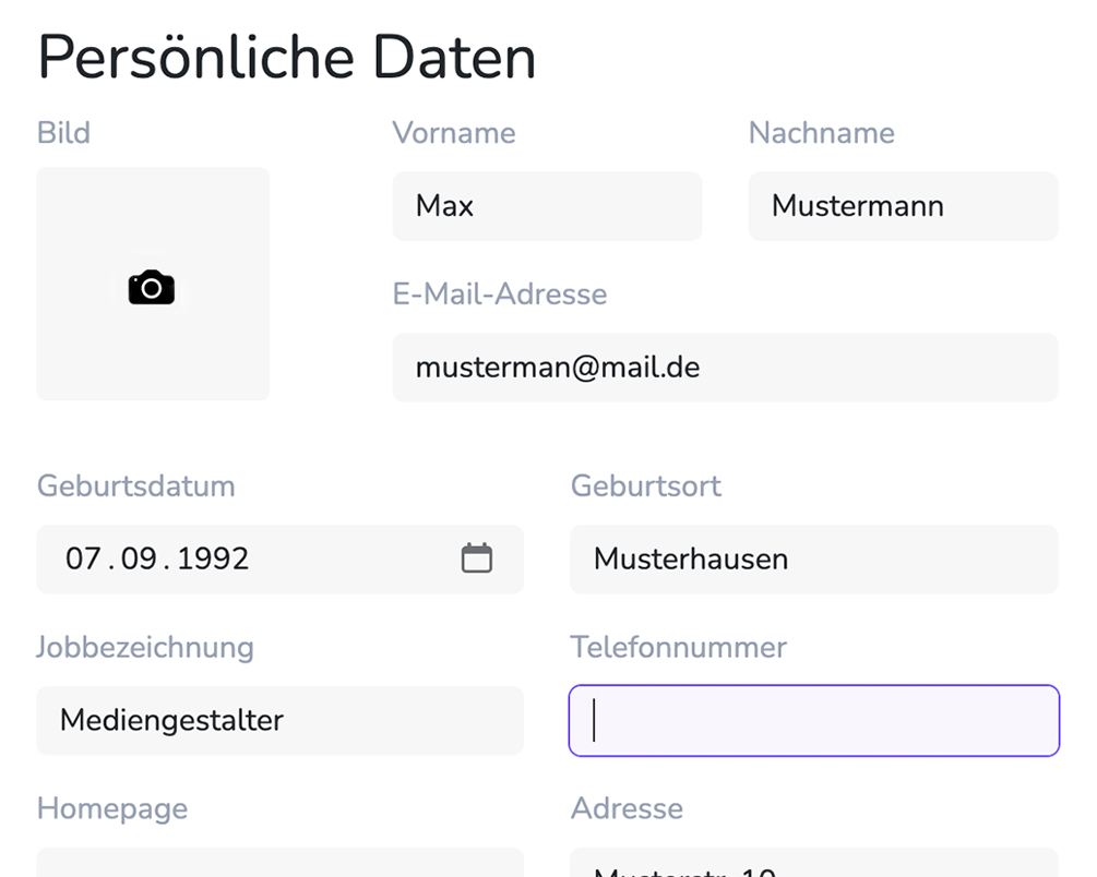 Trage deine wichtigsten Informationen ein: persönliche Daten, Berufserfahrung, Ausbildung, Sprachkenntnisse, Fähigkeiten und mehr. Unser übersichtliches Formular führt dich Schritt für Schritt durch alle relevanten Bereiche. So vergisst du nichts – und alles landet an der richtigen Stelle.